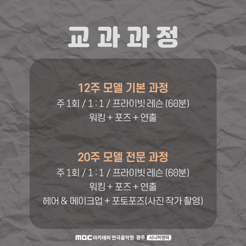 [시니어센터] 2024 교과과정 안내 페이지 정보 작성자 MBC아카데미연극음악원광주 댓글 0건 조회 7,654회 작성일 24-04-30 17:29 본문 목록 이전글 성인 클래스 교과과정 - 연기 & 뮤지컬 24.04.30 다음글 [연기센터] 틴스타반(중1 - 고1) 교과과정 안내 24.04.27