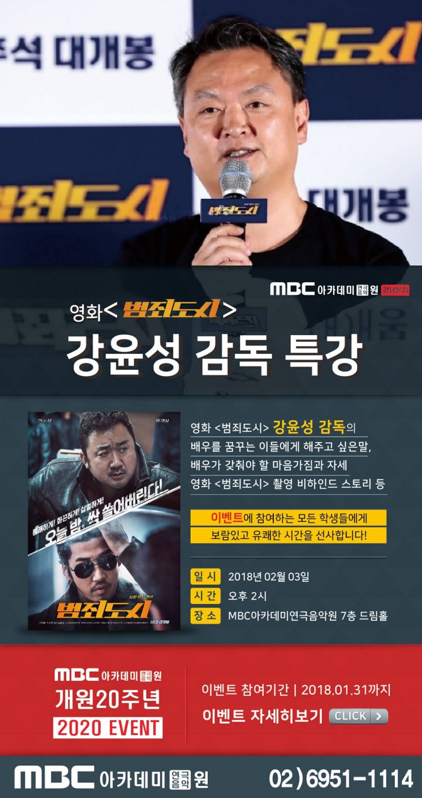 [드라마센터] 영화 '범죄도시' 강윤성 감독 특강 페이지 정보 작성자 관리자 댓글 0건 조회 22,202회 작성일 18-01-11 22:08 본문 영화 '범죄도시' 강윤성 감독 특강 목록 이전글 뮤지컬 취미반 개강! 18.01.27 다음글 [드라마센터] 20주년 기념 장학생 선발 오디션 - 연기 / 뮤지컬 18.01.05